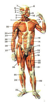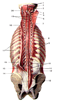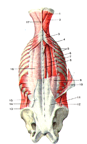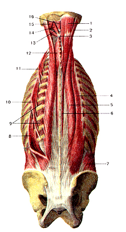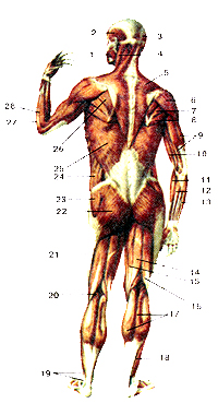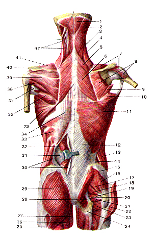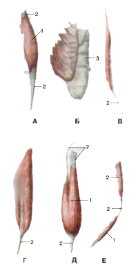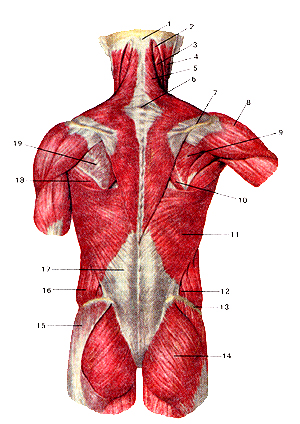 ![]() Рис. 98. Мышцы передней поверхности тела человека. Рис. 99. Мышцы задней поверхности тела человека. Fig. 100. Different shapes of muscles. A—fusiform muscle; Б-flat muscle; B-unipennate muscle; Г—bipennate muscles-two-headed muscle; E-two-bellied muscle. 1-belly of muscle; 2-tendon; 3-aponeurous (wide tendon). Рис. 101. Поверхностные мышцы спины. Рис. 103. Мышцы спины и затылка (Мышцы и кости плечевого пояса удалены). 1-полуостистая мышца головы; 2-ременная мышца головы; 3-верхняя задняя зубчатая мышца; 4-ременная мышца шеи; 5-наружные межреберные мышцы; 6-подвздошно-реберная мышца спины; 7-длиниейшая мышца спины; 8-остистая мышца; 9-нижняя задняя зубчатая мышца; 10-широчайшая мышца спины (перерезана и отвернута в сторону); 11-апоневроз широчайшей мышцы спины; 12-поясничный треугольник; 13-гребень подвздошной кости; 14-внутренняя косая мышца живота; 15-на-ружная косая мышца живота; 16-грудогюясничная фасция; 17-выйная связка.