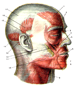 Рис. 107. Мимические мышцы. Вид справа. 1-лобное брюшко надчерепной (затылочно-лобной) мышцы; 2-круговая мышца глаза; 3-мышца гордецов; 4-мышца, поднимающая верхнюю губу; 5-носовая мышца (крыльная часть); 6-кру-говая мышца рта; 7-мышца, опускающая нижнюю губу; 8-мыш-ца, опускающая угол рта; 9-подкожная мышца шеи; 10-мышца смеха; 11-большая скуловая мышца; 12-жевательная фасция; 13-задняя ушная мышца; 14-затылочное брюшко надчерепной мышцы; 15-передняя ушная мышца; 16-верхняя ушная мышца; 17-сухожильный шлем (надчерепной апоневроз) надчерепной мышцы. Поделитесь этой записью или добавьте в закладки |