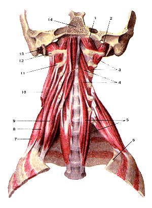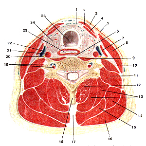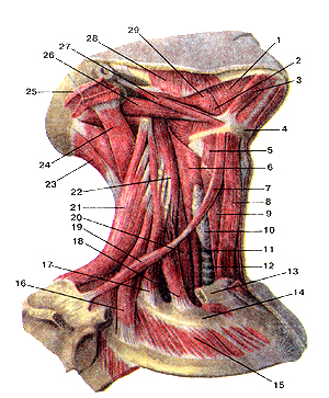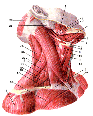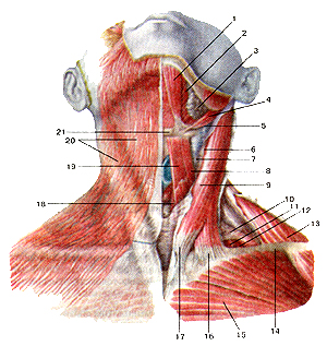 Рис. 110. Поверхностные мышцы шеи. Вид спереди. 1-переднее брюшко двубрюшной мышцы; 2-челюстно-подья-зычная мышца; 3-подчелюстная слюнная железа; 4-шило-подъя-зычная мышца; 5-заднее брюшко двубрюшной мышцы; 6-внут-ренняя яремная вена; 7-обшая сонная артерия; 8-верхнее брюшко лопаточно-подъязычной: мышцы; 9-грудино-ключич-но-сосцевидная мышца; 10-нижнее брюшко лопаточно-подъязычной мышца; 11-средняя лестничная мышца; 12-задняя лестничная мышца; 13-трапециевидная мышца; 14-ключица; 15-6олыиая фудная мышца; 16-ключичная часть фудино-клю-чично-сосцевидной мышцы; 17-фудинная часть фудино-клю-чично-сосцевидной мышцы; 18-фудино-щитовидная мышца; 19-фудино-подъязычная мышца; 20-подкожная мышца шеи; 21-подъязычная кость. Рис. 112. Мышцы шеи. Подкожная мышца шеи и грудино-клю-