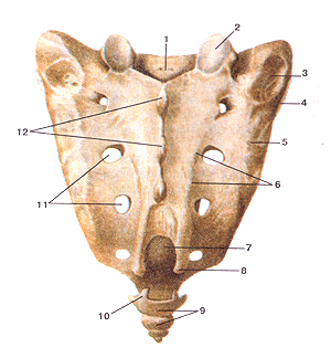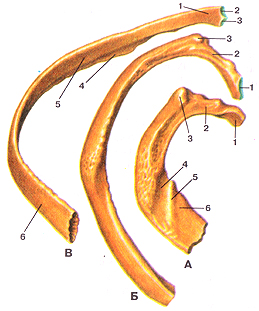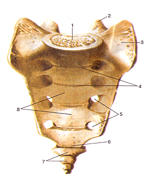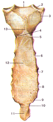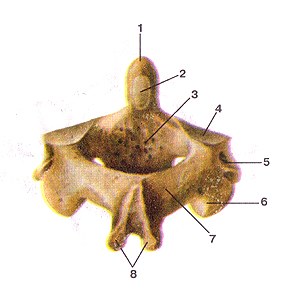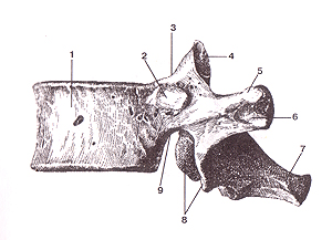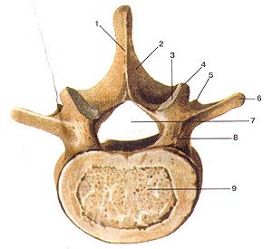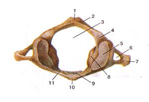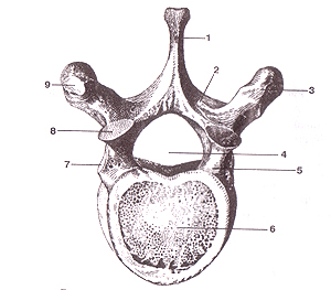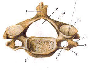 Рнс. 4. Грудной позвонок. Вид сверху. Рис. 6. Первый шейный позвонок (атлант—atlas). Вид сверху. I-задний бугорок; 2-задняя дуга; 3-позвоночное отверстие; 4-бо-розда позвоночной артерии; 5-верхняя суставная ямка; 6-попе-речное отверстие (отверстие поперечного отростка); 7-попереч-иый отросток; 8-латеральная масса; 9-ямка зуба; 10-передний бугорок; 11 -передняя дуга. Рис. 9. Поясничный позвонок (vertebra lumbalis). Вид сверху. 1-остистый отросток; 2-дуга позвонка; 3-верхний суставной отросток: 4-сосцевидный отросток; S-добавочный отросток; 6-по-перечный отросток; 7-позвоночное отверстие; 8-ножка дуги позвонка; 9-тело позвонка.