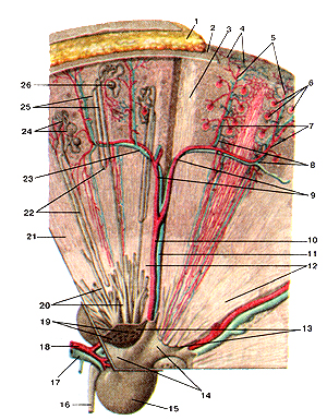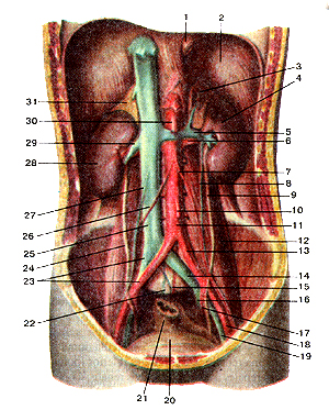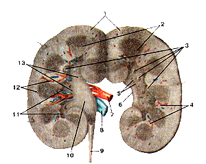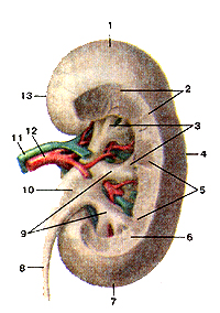 Рис. 219. Мочевые органы (organa urinaria) в брюшной полости.Вид спереди. Пристеночная брюшина удалена. 1-пищевод (отрезан); 2-диафрагма; 3-левый надпочечник; 4-ле-вая почка; 5-левая почечная вена; 6-левая почечная артерия; 7-левая яичковая артерия; 8-левая яичковая вена; 9-левый мочеточник; 10-нижняя брыжеечная артерия; 11-аорта; 12-большая поясничная мышца; 13-левая общая подвздошная артерия; 14-левая общая подвздошная вена; 15-срединная крестцовая артерия; 16-левая внутренняя подвздошная вена; 17-левая внуг-ренняя подвздошная артерия; 18-левая наружная подвздошная артерия; 19-левая наружная подвздошная вена; 20-мочевой пузырь; 21-прямая кишка (отрезана); 22-мыс крестца; 23-правая общая подвздошная артерия; 24-правый мочеточник; 25-нижняя полая вена; 26-правая яичковая артерия; 27-правая яичковая вена; 28-правая почка; 29-иравая почечная вена; 30-верхняя брыжеечная артерия; 31-правый надпочечник.Fig. 219. Мочевые органы в брюшной полости.Вид спереди. Пристеночная брюшина удалена. 1 -oesophagus (удален); 2-diaphragma; 3-glandula suprarenalis sinistra; 4-ren sinister; 5-v.renalis sinistra; 6-a.renalis sinistra; 7-a.testicularis sinistra; 8-v.testicularis sinistra; 9-ureter sinister; 10-a.mesenterica inferior; 11-aorta; 12-m.psoas major; 13-a.iliaca communis sinistra; 14-v.testicularis sinistra; IS-a.sacralis mediana; 16-v.iliaca interna sinistra; 17-a.iliaca interna sinistra; 18-a.iliacaexterna sinistra; 19-v.iliacaexter-na sinistra; 20-vesica urinaria; 21-rectum; 22-promontorium sacrale; 23-a.iliaca communis dextra; 24-ureter dexter; 25-v.cava inferior; 26-a.testicularis dextra; 27-v.testicularis dextra; 28-ren dexter; 29-v.renalis dextra; 30-a.mesenterica superior; 31-glandula suprarenalis dextra.Fig. 219. Urinary organs in abdomen.Anterior aspect. Parietal peritoneum is absent.1-esophageus (absent); 2-diaphragma; 3-left epinephros; 4-left kidney;«_iaft ivnai win- ft-ieft renal artery; 7-left testicular artery; 8-left testic- psoas major; 13-left common iliac artery; 14-left common iliac vein; 15- median sacral artery; 16-left internal iliac vein; 17-left internal iliac artery; 18- left external iliac artery; 19-left external iliac vein; 20-uri-nary bladder; 21-rectum (absent); 22-promontary; 23-right common iliac artery; 24-right common iliac vein; 25-inferiorvena cava; 26-right testicular artery; 27-right testicularvein; 28-right kidney; 29-right renal Рис. 220. Почка (ren),правая. Вид сзади. Часть почечной ткани в области ворот удалена. 1-верхний конец (полюс); 2-корковое вещество почки; 3-малые почечные чашки; 4-латеральный (боковой) край почки; 5-мозговое вещество почки (почечные пирамиды); 6-почечный столб; 7-нижний конец (полюс) почки; 8-мочеточник;9-большие почечные чашки; 10-почечная лоханка; 11-по-чечная вена; 12-почечная артерия; 13-медиальный край почки.Fig. 220. Почка правая. Вид сзади. Часть почечной ткани вобласти ворот удалена.1-extreinilas superior (polus superior); 2-cortex renalis; 3-calices renales minores; 4-margo lateralis; 5-medulla renalis (pyramides renales); 6-columna renalis; 7-ezxtremitas interior (polus interior); 8-ureter; 9- calices renales majores; 10-pelvis renalis; 11-v. renalis; 12-a. renalis; 13-margo medialis (renalis).Fig. 220. Kidney right. Part of renal tissue is ablated in region of it'shilum.1-superior extremity (pole); 2-renal cortex; 3-minor calices (of kidney); 4-leteral border (of kidney); 5-renal medulla(renal pyramids); 6-renal column; 7-inferior extremity (pole); 8-ureter; 9-major calices (of kidnev): 10-renal pelvis; 11-renal vein; 12-renal artery; 13-medialbor- Рис. 221. Почка (ген) правая. Почка вскрыта фронтальный разрезом,1-корковое вещество почки; 2-почечные пирамиды; 3-почечные сосочки; 4-почечные столбы; 5-почечная пазуха; 6-почечные ворога; 7-почечная артерия; Х-почечная вена: 9-мочеточник; 10-почечнаи лоханка; 11-малые почечные чашки; 12-кровенос-ные сосуды; !3-большие почечные чашки.Fig. 221. Почка правая. Почка вскрыта фронтальный разрезом. I-cortex renalis; 2-pyramides renales; 3-papillae renales; 4-columnae renales; 5-sinus renalis; 6-hilum renalis; 7-a-renalis; 8-v-renalis; 9-ureter; Ш-pelvis renalis; ll-calyces renales minores; 12-vasa san-guinea; 13-calyces renales majores.Fig. 221. Kidney right. Kidney is opened by trontal section. 1-renal cortex; 2-rcnal pyramids; 3-renal papilles; 4- renal columns; 5-renal sinus; 6-hilum ot" kidney; 7-renal anery; S-renal vein; 9- ureters; 10-renal pelvis; 11-renal calices minor; 12-blood vessels; 13-majorcal-