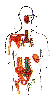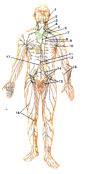 Рис. 239. Расположение центральных и периферических органов иммунной системы в теле человека.