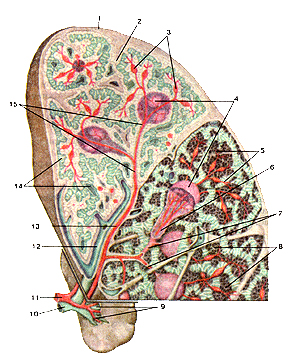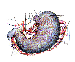 Рис. 255. Лимфатические сосуды и узлы желудка. Вид спереди. 1-лимфатические сосуды; 2-селезеночные лимфатические узлы; 3-левые желудочно-сальниковые лимфатические узлы; 4-правые желудочно-сальниковые лимфатические узлы; 6-надприв-ратниковые лимфатические узлы; 7-печеночные лимфатические умы; 8-чревные лимфатические узлы; 9-левые желудочные лимфатические узлы; 10-кардиальные лимфатические узлы (лимфатическое кольцо кардии). Поделитесь этой записью или добавьте в закладки |