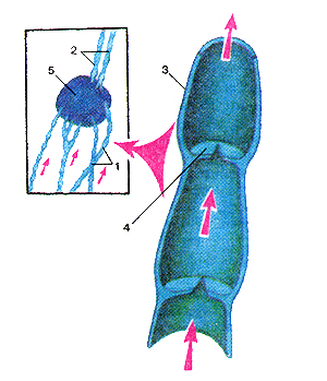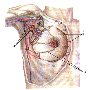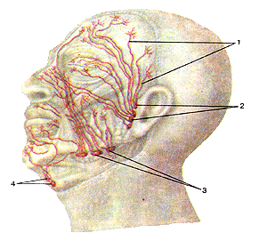 Рис. 249. Схема строения лимфатических сосудов. 1-приносящие лимфатические сосуды; 2-выносящие лимфати ческие сосуды; 3-стенка лимфатического сосуда: 4-клапан 5-лимфатический узел. Рис. 251. Лимфатические сосуды и узлы головы. Вид слева. 1-лимфатические сосуды; 2-поверхностные околоушные лимфатические узлы; 3-поднижнечелюстные лимфатические узлы; 4-подбородочнне лимфатические узлы.