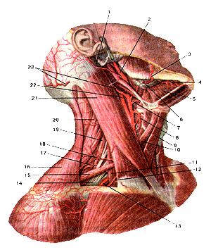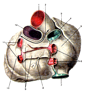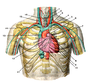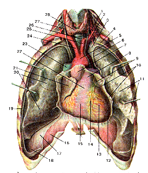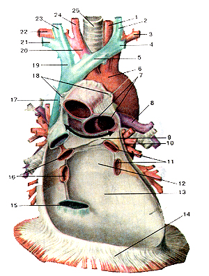 Рис. 280. Положение сердца в перикарде (околосердечнойсумке). Перикард ( pericardium) и плевральные полости вскрыты. Передние края правого и левого легких оттянуты в стороны. Вид спереди.I-левый блуждающий нерв; 2-левая подключичная артерия; 3-ку-пол плевры; 4-первое ребро; 5-дута аорты; 6-средостенная (медиа-стинальная) плевра; 7-восходящая часть аорты (покрыта серозным перикардом); 8-легочный ствол (покрыт серозным перикардом); 9-левое ушко (сердца); 10-перикард (разрезан и отвернут в стороны); П-левое легкое; 12-верхушка сердца; 13-левый желудочек; 14-передняя межжелудочковая борозда; 15-правый желудочек; 16-диафрагма; 17-диафрагмальная плевра; 18-реберно-диафраг-мальный синус; 19-реберная плевра; 20-правое легкое; 21-правое ушко (сердца); 22-артериальный конус; 23-верхняя полая вена; 24-плечеголовной ствол; 25-левая общая сонная артерия; 26-тра-хея; 27-правый блуждающий нерв; 28-щитовидная железа.Fig. 280. Положение сердца в перикарде (околосердечной сумке). Перикард и плевральные полости вскрыты. Передние края правою и левого легких оттянуты в стороны. Вид спереди. I-n.vagussinister; 2-a.subclaviasinistra; 3-cupula pleurae; 4-costa I; 5-arcus aortae; 6-pleura mediastinalis; 7-aorta ascendcns; 8-truncuspul-monalis; 9-auricula sinistra (cordis); 10-pericardium; 11-pulmo sinister; 12-apexcordis; 13-ventriculus sinister; 14-sulcus interventricularis anterior; 15-ventriculus dexter; 16-diaphragma; 17-pleura diaphrag-matica; 18-sinus costodiaphragmaticus; 19-pleura costalis; 20-pulmo dexter; 21 -auricula dextra(cordis); 22-conus arteriosus; 23-v.cava superior; 24-truncus brachiocephalicus: 25-a.carotis communis sinistra; 26-trachea; 27-n.vagus dexter; 28-glandula thyreoidea.Fig. 280. Position of heart in the pericardium (pericardial cavity). Pericardium and pleural cavities are opened. Anterior border of rightand left lungs are unfolded. Anterior aspect.1-left vagus nerve; 2-left subclavian artery; 3-cervical pleura (pleural cupula); 4-first rib; 5-arch of aorta; 6-mediastinal part (of parietal plearae); 7-ascending aorta (is covered with serous pericardium); 8-pulmonary tmnk (is covered with serous pericardium); 9-left auricle ofhcart; 10-pcricardium (is cut and unfolded): I l-left lung; 12-apexof heart; 13-left ventricle; 'l4-anterior interventricular sulcus; 15-right ventricle; 16-diapliragm; 17 -diaphragmatic part (parietal pleara); 18-costodiaphragmatic recess; 19-costal part (of parietal pleara); 20-right lung; 21-right auricle of heart; 22-arterial sinus; 23-superior vena cava; 24-brachioecphalie trunk: 25-left common carotid artery; 26-trachea; 27-right vagus nerve; 28-thyroid gland. Рис. 281. Задняя стенка перикарда.Передняя стенка перикарда и сердце удалены. Вид спереди. 1-левая общая сонная артерия; 2-левая внутренняя яремная вена; 3-левая подключичная артерия; 4-левая подключичная вена; 5-левая плсчегшовная вена; 6-дуга аорты; 7-легочный ствол (место его деления на правую и левую легочные артерии); 8-левая легочная артерия; 9-стрелка показывает положение поперечного синуса перикарда; 10-перикард (зона отреза); 11-левые легочные вены; 12-косой синус перикарда; 13-задняя стенка перикарда; 14-диафрагма; 15-нижняя полая вена; 16-правые легочные вены; 17-верхняя полая вена; 18-место перехода перикарда на аорту и другие крупные кровеносные сосуды; 19-правая плечеголовная вена; 20-плечеголовной ствол; 21-правая подключичная вена; 22-правая подключичная артерия; 23-правая внутренняя яремная вена; 24-правая общая сонная артерия; 25-трахея.Fig. 281. Задняя стенка перикарда.Передняя стенка перикарда и сердце удалены. Вид спереди. I-a. carotis communis sinistra; 2-v. jugularis intema sinistra; 3-a. subclavia sinistra; 4-v. subclavia sinistra; S-v.brachiocephalica; 6-arcus aortae; 7-truncus pulmonalis; 8-a. pulmonalis sinistra; 9-sinus trans-verus pericardii; 10-pericardium; 11-w. pulmonales sinistrae; 12-sinus obliquus pericardii; 13-paries pericardii posterior; 14-diaphragma; 15-v. cava inferior; 16-vv. pulmonales dextrae; 17-v. cava superior; 18-; 19-v.brachiocephalica; 20-truncus brachiocephalicus dexter; 21-v. subclavia dextra; 22-a. subclavia dextra; 23-v. jugularis interna dextra; 24-a. carotis communis dextra; 25-trachea.Fig. 281. Posterior wall of pericardium.Anterior wall of pericardium and heart are removed. Frontal view. I-left common carotid artery; 2-left internal jugular vein; 3-left subclavian adery; 4-lefl subclavian vein; 5-left brachiocephalic vein; 6-arch of ao