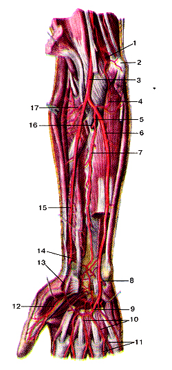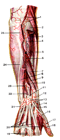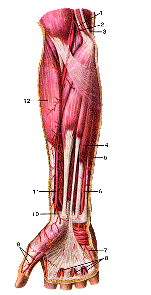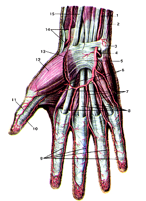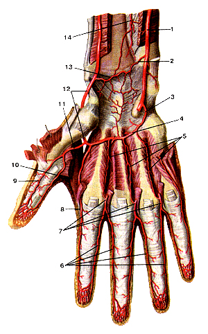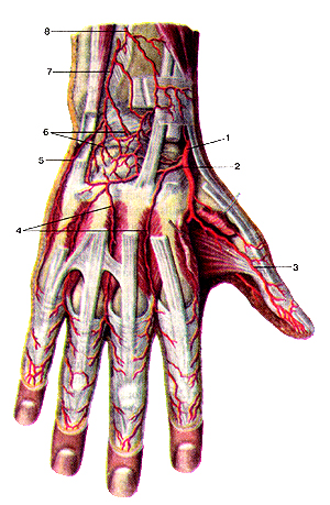Рис. 298. Артерии кисти, правой. Вид сзади. 1-лучевая артерия; 2-тыльная запястная ветвь лучевой артерии; 3-локтевая ладонная артерия большого пальца кисти; 4-тыльиые пястные артерии; 5-тыльная запястная ветвь локтевой артерии; 6-тыльная сеть запястья; 7-тыльная межкостная артерия; 8-тыльная ветвь передней межкостной артерии. Поделитесь этой записью или добавьте в закладки |