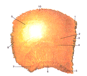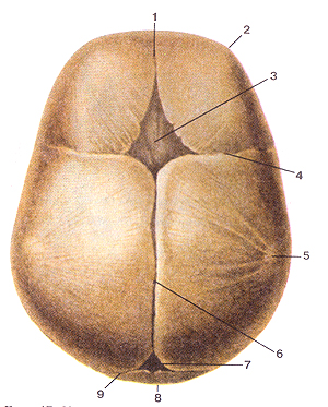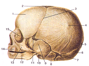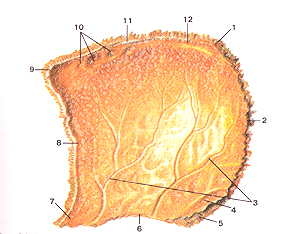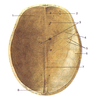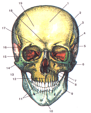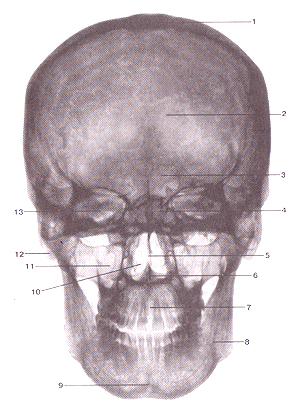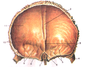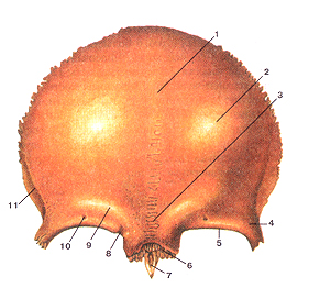 Рис. 17. Лобная кость (os frontale). Вид спереди. 1-лобная чешуя; 2-лобный бугор; 3-глабелла (надпереносье); 4-скуловой отросток; 5-надглазничный край; 6-носовая часть (лобной кости); 7-носовая ость; 8-лобная вырезка; 9-надбровная дуга; 10-надглазничное отверстие; 11-височная линия.