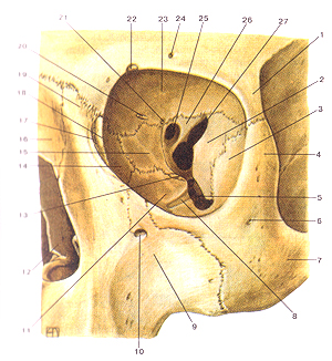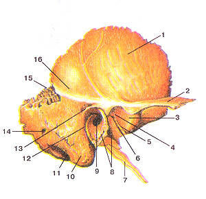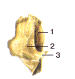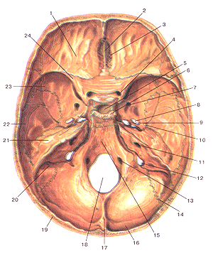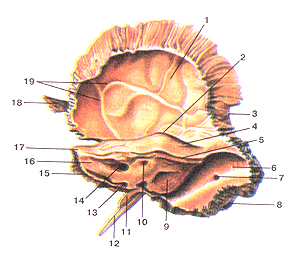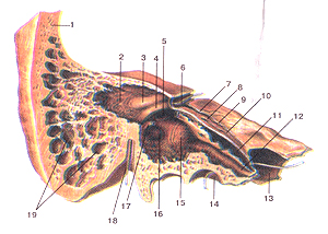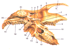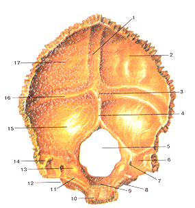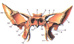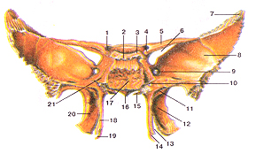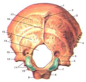 Рис. 21. Затылочная кость (os occipitale). Вид спереди. 1-борозда верхнего сагиттального синуса; 2-чешуя затылочной кости; 3-внутренний затылочный выступ; 4-внутренний затылочный гребень; 5-большое затылочное отверстие; 6-борозда сигмовидного синуса; 7-мышелковый канал; 8-борозда нижнего каменистого синуса; 9-скат; 10-базилярная (основная) часть; II-латеральная часть; 12-яремная вырезка; 13-яремный бугорок; 14-яремный отросток; 15-нижняя затылочная ямка; 16-борозда поперечного синуса; 17-всрхняя затылочная ямка. Рис. 29. Височная кость (os temporale). Рис. 30. Височная кость (os temporale). Распил через барабанную