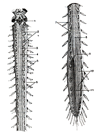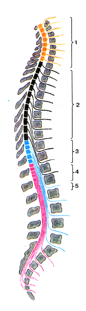 ![]() Рис. 333. Спинной мои (medulla spinalis) с корешками спинномозговых нервов. 1-ромбовидная ямка (головного мозга) 2-корсшки спинномозговых нервов; 3-шейное утолщение спинного мозга; 4-задняя срединная борозда; 5-СГШНОМОЗГОВЫе нервы; 6-твердая оболочка спинного мозга; 7-зубчатая связка; 8-поясничное утолщение спинного мозга; 9-конус спинного мозга; 10-«конский хвост» (корешки поясничных и крестцовых спинно-мозговых нервов); 11-концевая (терминальная) нить. Fig. 333. Спинной мозге корешками спинно-мозговых нервов. 1-fossa rhomboidea (eneephali); 2-radices nervorum spinalis; 3-intu-mescentia cerviealis medullae spinalis; 4-suleus medianus posterior; 5-nervi cerebrospinalis; 6-dura maler medullae spinalis; 7-ligamen(um denticulalum; 8-intumescentia lumbalis medullae spinalis; .9-conus medullae spinalis; 10-caudaequina; I l-filum terminale. Fig. 333. Spinal cord with the roots ol'spinal nerves. 1-rhomboid fossa (of the cerebrum); 2-roots of spinal nerves; 3-cervi-cal enlargement of spinal cord; 4-posterior median sulcus; 5-spinal nerves; 6-dura mater ol'spinal cord; 7-denticulate ligament; 8-lumbar enlargement of spinal cord; 9-medullary cone; 10-«horse tail» (roots of the lumbar and sacral spinal nerves); 11-terminal filum.