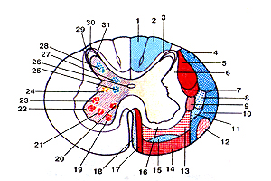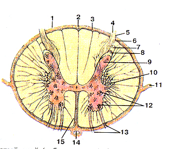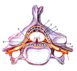 Рис. 337. Оболочки спинного мозга (meninges medullae spinalis) позвоночном канале. Поперечный разрез на уровне Поделитесь этой записью или добавьте в закладки |