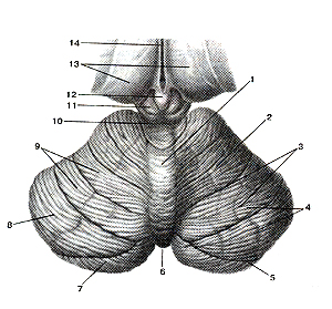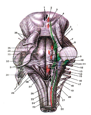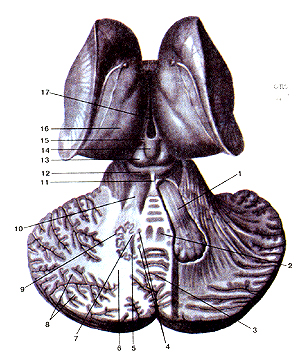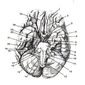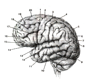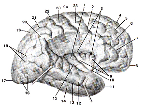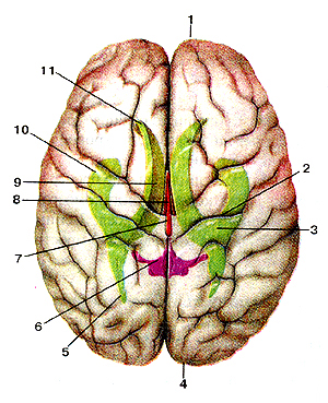 Рис. 338. Большой мозг (cerebrum). Проекция боковых желудочков на поверхность полушарий большого