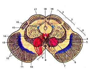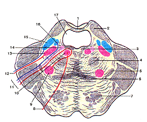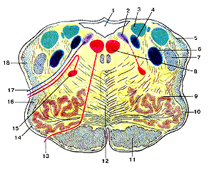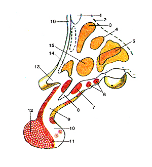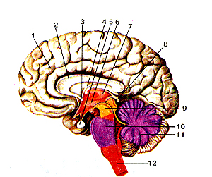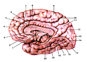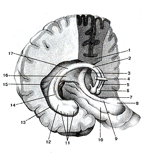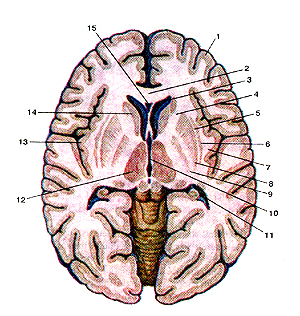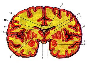Рис. 344. Базальные (подкорковые) узлы (nuclei basales) и внутренняя капсула (capsula interna) на горизонтальном разрезе Рис. 345. Базальныс (подкорковые) умы (nuclei basales) на фронтальном разрезе головного мозга, разрез сделан на уровне