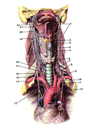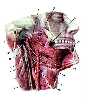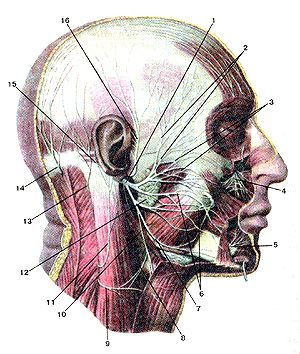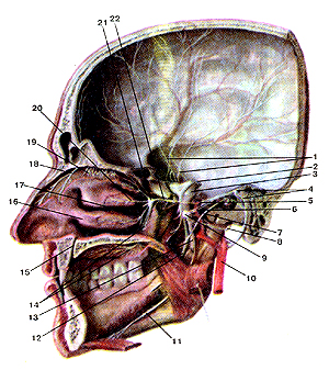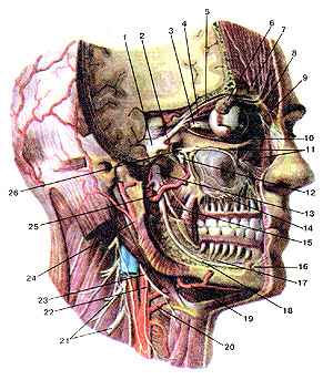 Рис. 360. Тройничный нерв (nervus trigeminus) и его ветви.Вид справа. Часть верхней и нижней челюстей удалена. 1-тройничный узел; 2-глазной нерв; 3-ресничный узел; 4-носо-слезный нерв; 5-лобный нерв; 6-слезная железа; 7-надглазнич-ный нерв; 8-надблоковый нерв; 9-подблоковый нерв; 10-глазо-двигательный нерв; 11-подглазничный нерв; 12-крылонебный узел; 13-нижнечелюстной нерв; 14-верхнее зубное сплетение; 15-язычный нерв; 16-подбородочный нерв; 17-нижнее зубное сплетение; 18-нижний альвеолярный нерв; 19-лицевая артерия; 20-язычная артерия; 21-шейное сплетение; 22-верхний корешок шейной петли; 23-подъязычный нерв; 24-наружная сонная артерия; 25-верхнечелюстная артерия; 26-верхнечелюстной нерв.Fig. 360. Тройничный нерв и его ветви. Вид справа. Часть верхней и нижней челюстей удалена. 1-ganglion trigeminus; 2-nervus ophtalmicus; 3-nodus cilaris; 4-nervus nasolacrirr.alis; 5-nervus frontalis; 6-glandula lacrimalis; 7-nervus supra-orbitalis; 8-nervus supratrochlearis; 9-nervus infratrochlearis; 10-nervus oculomotorius; 11 -nervus infraorbitalis; 12-ganglion pterygopalatinus; 13-nervus mandibularis; 14-plexusdenlalis superior; 15-nervus lingualis; 16-nervus mentalis; 17-plexusdentalis inferior; 18-nervus alveolaris inferior; 19-arteria facialis; 20-arteria lingualis; 21-plexus cervicalis; 22-radix superior (ansae cervicis); 23-nervus hypoglossus; 24-arteria corolica externa; 25-arteria maxillaries; 26-nervus maxillaries.Fig. 360. Trigeminal nerve, and its branches. Right aspect.The parts ot'maxille and mandible were removed, l-trigeminal ganglion; 2-ophthalmic nerve; 3-ciliary ganglion; 4-nasocil-iary nerve; 5-frontal nerve; 6-lacrimal gland; 7-supraorbital nerve; 8-supra-trochlear nerve; 9-infratrochlear nerve; 10-oculomotor nerve; 11-infraor-bital nerve; 12-pterygopalatine ganglion; 13-mandibular nerve; 14-superior dental plexus; 15-lingual nerve; 16-mental nerve; 17-inferior dental plexus; 18-inferior alveolar nerve; 19-facial artery; 20-lingual artery; 21-cervical plexus; 22-superior root of ansa cervicalis; 23-hypoglossal nerve; 24-external carotid anery; 25-maxillary artery; 26-maxillary nerve. Рис. 361. Тройничный нерв (nervus trigeminus) и его ветви. Сагиттальный распил. Вид с медиальной стороны. Удалена частьслизистой оболочки стенки полости носа и твердого неба. 1-оболочечные ветви; 2-тройничный нерв; 3-тройничный узел; 4-лицевой нерв; 5-большой каменистый нерв; 6-малый каменистый нерв; 7-барабанная струна; 8-ушно-височний нерв; 9-ушной узел; 10-наружная сонная артерия; 11-челюстно-модъязычный нерв; 12-язычный нерв; 13-нижний альвеолярный нерв; 14-небные нервы; 15-резцовый канал; 16-нижняя носовая раковина; 17-латеральные нижние задние носовые ветви; 18-передний обонятельный нерв; 19-обонятельные нервы; 20-латеральные верхние задние носовые ветви; 21-крылонебный узел; 22-нерв крыловидного канала.Fig. 361. Тройничный нерв и его ветви. Сагиттальный распил.Вид с медиальной стороны. Удалена часть слизистой оболочкистенки полости носа и твердого неба.1-rr.meningei; 2-n. trigeminus; 3-ganglion trigeminale; 4-n.facialis; 5-n. petrosus major; 6-n. petrosus minor; 7-chorda tympani; 8-n. auricu-lolemporalis; 9-ganglion oticum; 10-arteria carotis externa; 11-n. mylohyoideus; 12-n. lingualis; 13-n.alveo!aris interior; 14-nn. palatini; 15-canalis incisivus; 16-concha nasalis inferior; 17-rr. nasales posteri-ores inferiores laterales; 18-n. olfactorius anterior; 19-nn. oltactorii; 20-rr. nasales posteriores superiores laterales; 21-ganglion ptery-gopalatinum; 22-n. canalis pterygopalatini.Fig. 361. Trigeminal nerve and its branches. Sagittal section. Medial aspect. The part ofmucosa! membrane ot'the wall of nasal cavity and of hard palate was removed.1-meningeal branches; 2-trigeminal nerve; 3-trigeminal ganglion; 4-facial nerve; 5-greater petrosal nerve; 6-lesser petrosal nerve; 7-chorda tympani; 8-auiiculotemporal nerve; 9-infratrochlear nerve; I0-external carotid artery; 11-mylohyoid nerve; 12-lingual nerve; 13-inferior alveolar nerve; 14-palatine nerves; 15-incisive canal; 16-inferior nasal concha; 17-inferior lateral nasal branches; 18-anterior olfactory nerve; 19-olfactory nerves; 20-superior lateral nasal branches; 21 -pterygopalaiine ganglion; 22-nerve of pterygoid canal. Рис. 362. Лицевой нерв (nervus facialis). Вид справа. 1-лицевой нерв; 2-височные ветви; 3-скуловые ветви; 4-подглаз-ничный нерв; 5-подбородочный нерв; 6-щечные ветви; 7-краевая ветвь нижней челюсти; 8-поверхностная шейная петля; 9-попе-речный нерв шеи; 10-шейная ветвь; 11-большой ушной нерв; 12-околоушная слюнная же