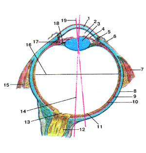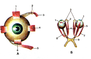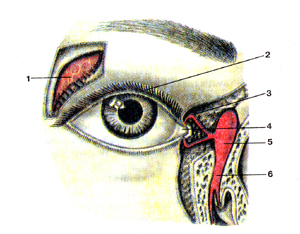 Рис. 386. Орган зрения. Схема строения глазного яблока (bulbusoculus), правого. Разрез в горизонтальной плоскости. Покачанаразличная кривизна хрусталика: слова - при расслабленииресничной мышцы, справа — при сокращенной ресничноймышце.1-роговица; 2-передняя камера глаза; 3-хрусгалик; 4-радужная оболочка; 5-задняя камера глаза; 6-коньюктива; 7-латеральная прямая мышца; 8-белочная оболочка (склера); 9-собственная сосудистая оболочка (хориоидеа); 10-сетчатка; П-центральная ямка; 12-зри-тельный нерв; 13-углубление диска; 14-наружная ось глаза; 15-ме-диальная прямая мышца; 16-понеречная ось глазного яблока; 17-ресничноетело; 18-ресничный поясок; 19-зрительная ось(глаза).Fig. 386. Орган зрения. Схема строения глазного яблока (bulbusoculus), правого. Разрез в горизонтальной плоскости. Показанаразличная кривизна хрусталика: слона - при расслабленииресничной мышцы, справа - при сокращенной ресничноймышце.1-cornea; 2-camera bulbi anterior; 3-lens; 4-iris; 5-camera bulbi posterior; 6-conjuctiva; 7-m. rectus lateralis; 8-sclera; 9-chorioidea; 10-reti-na; 11-fovea centralis; 12-n. opticus; 13-excavatio disci; 14-axis bulbi oculi externus; 15-m. rectus medialis; 16-axis bulbi oculi transversus; 17-софи5 ciliare; 18-zonula ciliaris; 19-axis opticus (bulbi oculi).Fig. 386. Eye and related structures. Scheme of the structure of theright eyeball. Horizontal section. The different curvatura of lens wasshown, namely in the case of relaxation of ciliary muscle as it wasdemonstrated on the left scheme, and in the case of contraction ofcil-iary muscle as it was demonstrated on the right scheme, l-cornea; 2-anterior chamber of eyeball; 3-lens; 4-iris; 5-posterior chamber of eye; 6-conjunctura; 7-lateral rectus; 8-sclera; 9-choroidea; 10-retina; 11-fovca centralis; 12-optic nerve; 13-depression of optic disc; 14-external axis of eyeball; 15-medial rectus; 16-transverseaxisof eyeball; 17-ciliarybody; 18-ciliary zonule; 19-optic axis (of eyeball).Рис. 387. Слезный аппарат правого глаза (apparatus lacrimalis).Вид спереди. Носо-слезный канал вскрыт.I-слезная железа; 2-верхнее веко: 3-верхний слезный каналец; 4-слезное озеро; 5-слезный мешок; 6-носо-слезный проток.Fig. 387. Слезный аппарат. Вид спереди. Носо-слезный канал вскрыт.l-glandula lacrimalis; 2-palpcbra superior; 3-canaliculus lacrimalis superioris: 4-lacus lacrimalis; 5-saccus lacrimalis; 6-ductus naso-lacrimalis.Fig. 387. Lacrimal apparatus of the right eyeball.Anterior aspect. Nasociliary canal was dissected. 1-lacrimal gland; 2-upper eyelid; 3-lacrimal canaliculus (superior); 4-lacrimal lake; 5-lacrimal sac; 6-nasolacrimal duct.Рис. 388. Мышцы глаза (musculi oculi). А-нид спереди; Б-вид сверху.I-верхняя прямая мышца; 2-блок; 3-верхняя косая мышца; 4-ме-диальная прямая мышца; 5-нижняя косая мышца; 6-нижняя прямая мышца; 7-латеральная прямая мышца; 8-зрительный нерв; 9-зрительный перекрест.Fig. 388. Мышцы глаза. А-вид спереди; Б~вид сверху.l-m. rectus superior; 2-trochlea; 3-m. obliquus superior; 4-m. rectus medialis; 5-m. obliquus inferior; 6-m. rectus interior; 7-m. rectus later-alis; 8-n. opticus; 9-chiasma opticum.Fig. 388. Muscles of eyeball. A-anterior aspect; B-superior aspect.1-superior rectus; 2-trochlea; 3-supcrior oblique; 4-medial rectus; 5-inferior oblique; 6-inferior rectus; 7-lateral rectus; 8-optic nerve; 9-optic chiasma.