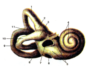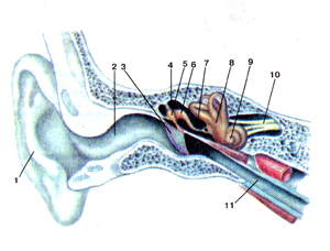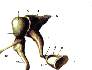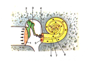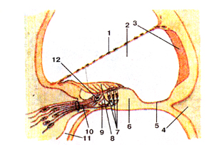 Рис. 389. Преддверно-улитковый орган (organum vestibulo-cochleare). Фронтальный разрез через наружный слуховой проход. Рис. 393. Схема распространения звуковой волны (показано стрелками) в наружном; среднем и внутреннем ухе. I-барабанная перепонка; 2-молоточек; 3-наковальня; 4-стремя; 5-круглое окно; 6-барабанная лестница; 7-улитковый проток; 8-лсстнииа преддверия. 1-преддверная мембрана; 2-улитковый проток; 3-сосудистая пс лоска; 4-костная стенка спирального канала улитки; 5-базиляр ная пластинка; 6-спиральный (кортиев) орган; 7-наружные воле сковые клетки спирального органа; 8-покровная мембран; 9-внутренний туннель; 10-нервные волокна; 11-спиральный узе улитки; 12-внутренняя волосковая клетки. Fig. 394. Схема строения улиткового протока. Попереч разрез. 1-membrana atriaiis: 2-ductus cochlcaris; 3-stria vasculose; 4-park osseus canalis spiralis cochlealc; 5-latina basilaris; 6-organon spirale; / cellulae capillares externae organi spiralcs; 8-membrana tectoria; ? cuniculus intcrnus; 10-fibrac nervosae; 11-nodus spiralis cochleae; 1/ cellulae capillares internae. Fig. 394. Scheme of structure of cochlcar duct. Transverse section. 1-vestibular membrane; 2-cochlearduct; 3-stria vascularis; 4-bony wa of spiral canal of cochlea; 5-basal lamina; 6-spiral organ; 7-oulcr ha cells of organ of corti; 8-tectorial membrane; 9-internal tunnel; К nervous fibres; 11-nervous fibres; 12-inner hair cells of organ of corti. Поделитесь этой записью или добавьте в закладки |