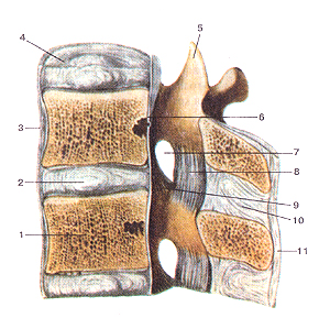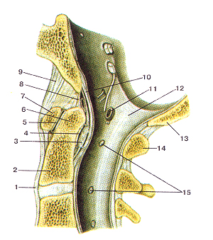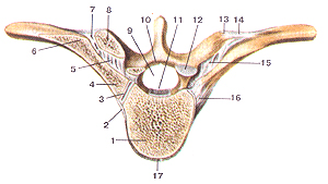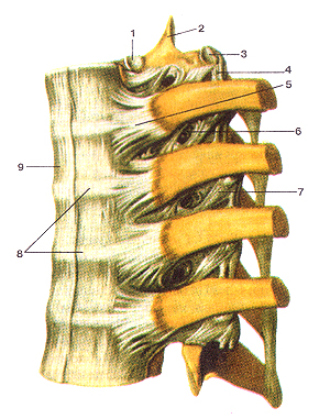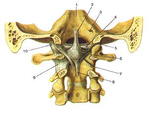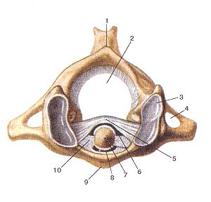 Рис. 69. Соединения позвонков. Рис. 71. Срединный атланто-осевой сустав (articulatio atlantoaxialis mediana). Вид сверху. 1-задний бугорок атланта; 2-позвоночное отверстие; 3-верхняя суставная ямка (атланта); 4-отверстие поперечного отростка атланта; 5-поперечная связка атланта; 6-срединный атланто-осевой сустав (задняя часть); 7-зуб осевого позвонка; 8-срединный атланто-осевой сустав (передняя часть); 9-передний бугорок атланта; 10-крыловидная связка. Поделитесь этой записью или добавьте в закладки |